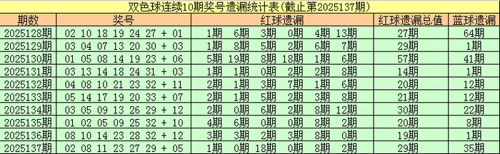甩掉双色球第2025137期,最近10期红球遗漏总值别离为:27期、29期、57期、14期、20期、21期、30期、20期、19期、29期,上期遗漏总期数偏高。