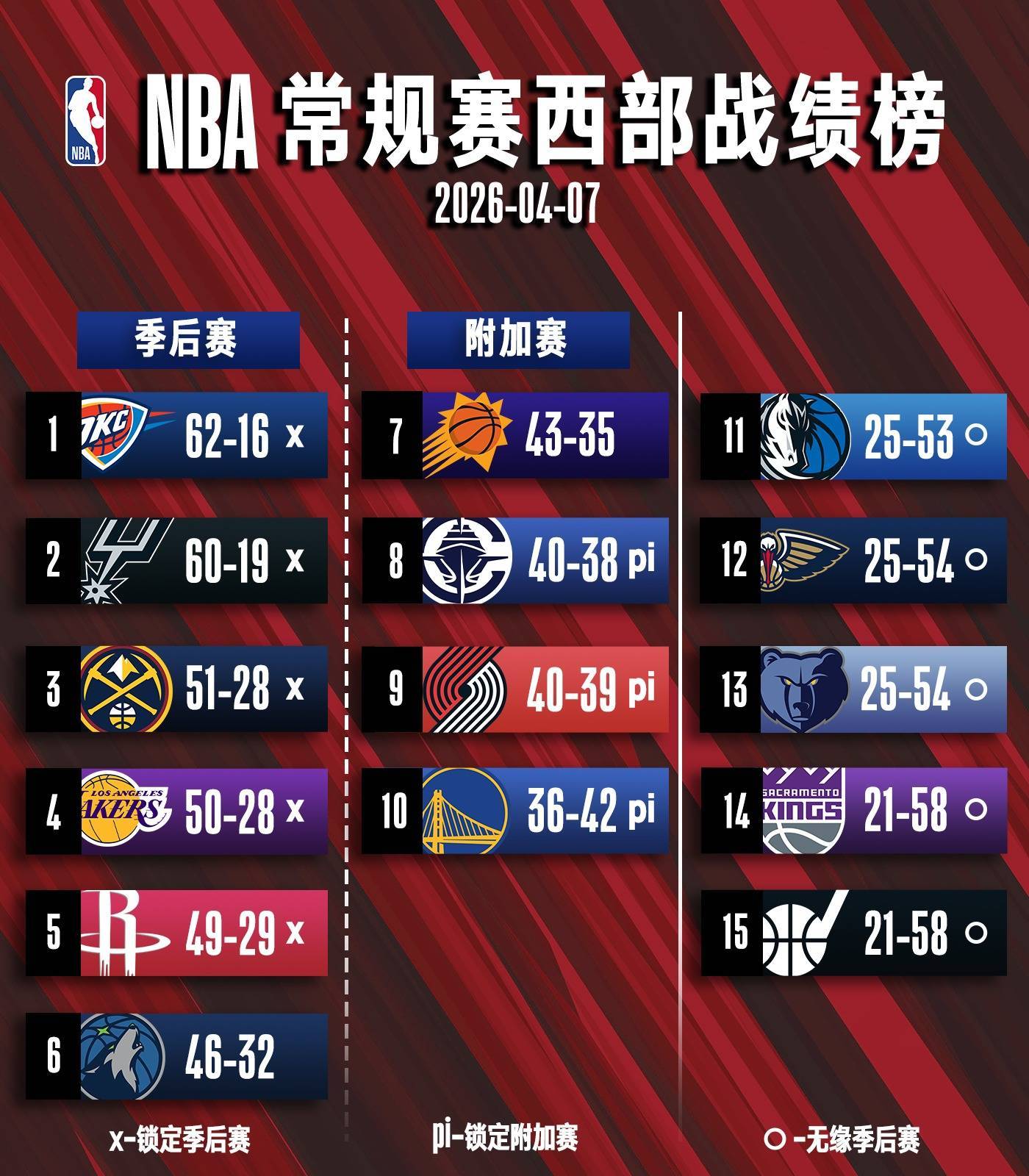 已锁定季后赛席位的球队如下——